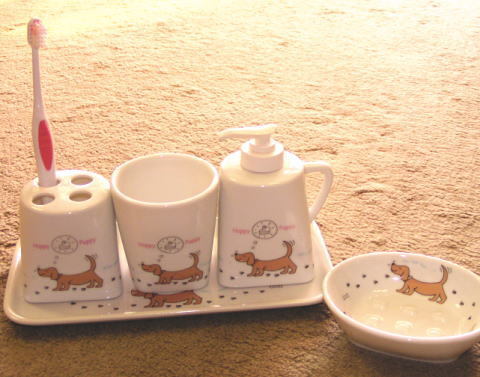 真っ白い陶器に、かわいいわんちゃん柄の洋食器が勢ぞろいしました。