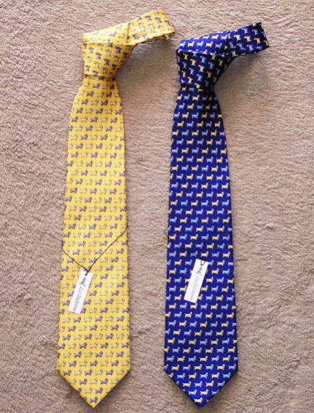 この柄のわんこは、足が短いので「ダックスフンド」かな?と思ったのですが、今まで(ネクタイで)私が見たダックス柄よりも、顔が大きい。。。(^^ゞ